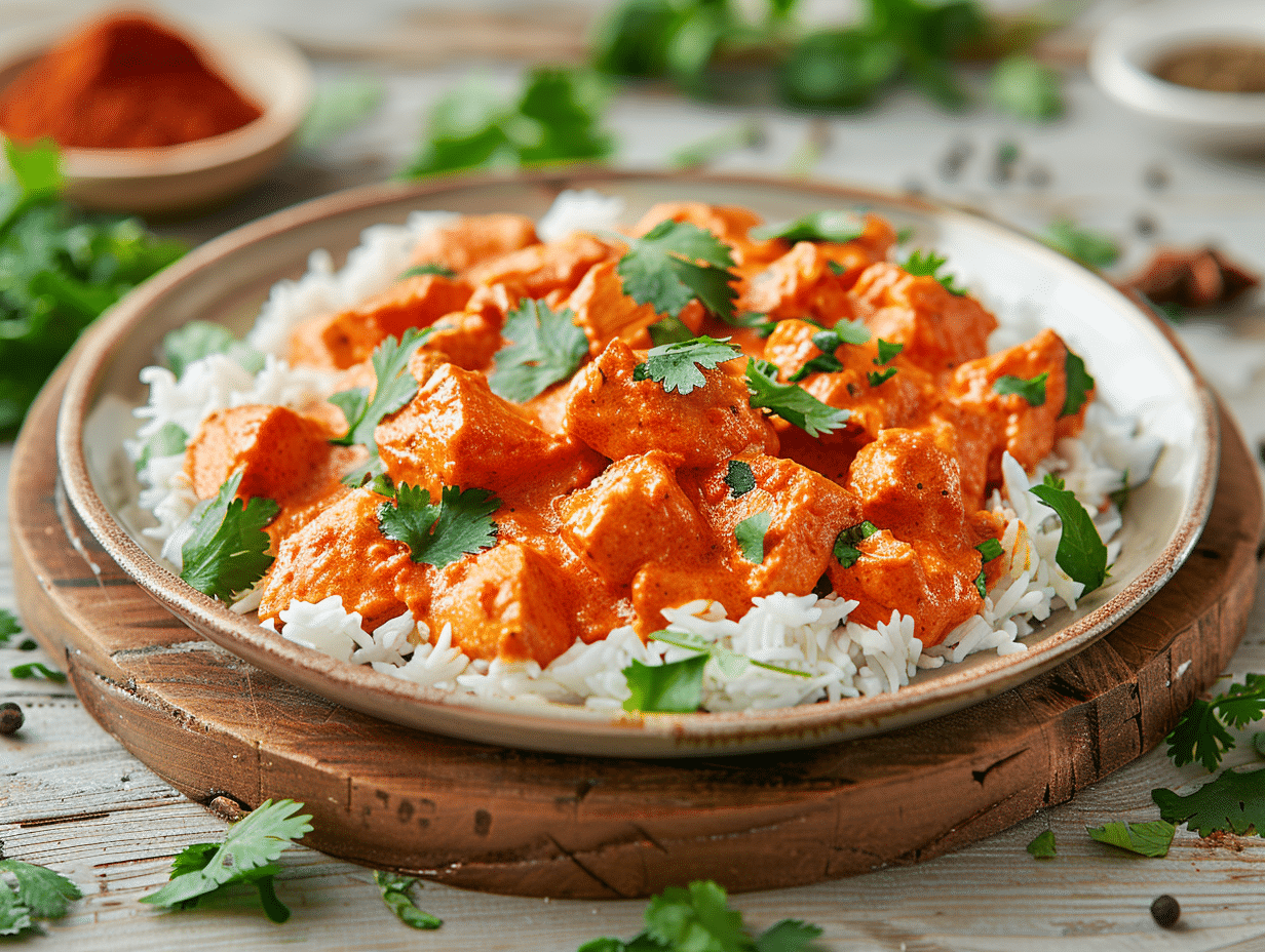 Ces ingrédients permettent de concocter un Poulet Tikka Massala aux saveurs équilibrées et intenses. Le yaourt à la grecque, mêlé aux épices telles que le massalé et le garam masala, apporte une onctuosité incomparable. Le lait de coco, quant à lui, adoucit le piquant et harmonise les saveurs. N’oubliez pas le gingembre frais et l’ail, indispensables pour une profondeur aromatique authentique. La coriandre fraîche rehausse le plat d’une note herbacée et rafraîchissante.